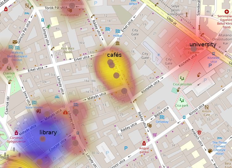 A café heat map. During my travels I noticed a correlation between the density of cafés and how lively the neighborhood is.